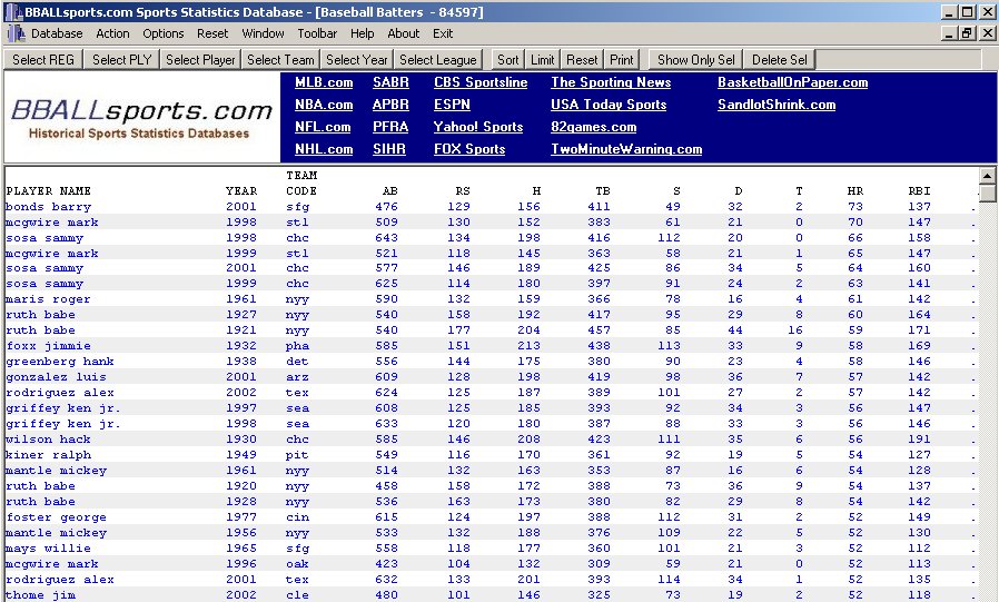 Free download.  Get all four sports in one database.  Click here to download the new SuperDB (25 Megs) See screenshot below.